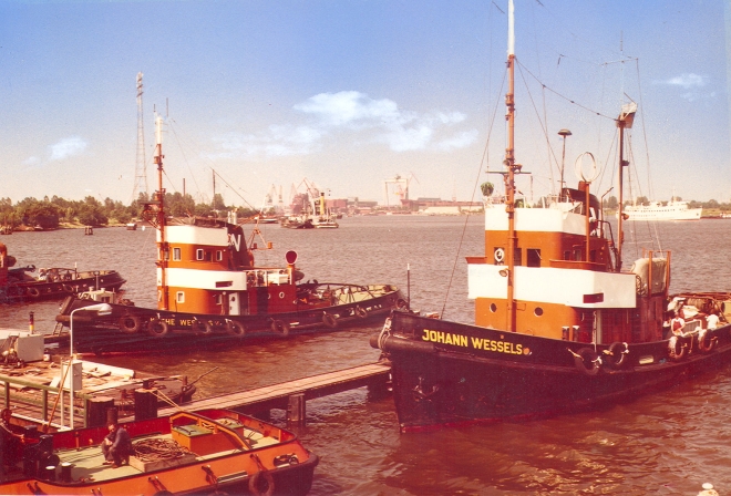 Die Aufnahme wurde 1976 gemacht und sollte als Vorlage für eine Postkarte dienen. Ob das Dortmunder Unternehmen „Cramers Kunstanstalt“ (Cekade), von 1900 bis zur Insolvenz 1989 einer der führenden Produzenten von Ansichtskarten, das Motiv tatsächlich in den Handel gebracht hat, ließ sich nicht ermitteln. Vielleicht vermittelte das Bild aber auch zu viel Idylle und zu wenig Betriebsamkeit. In den 1970er Jahren begann der Massengutumschlag im Emder Hafen allmählich zu sinken, da die Fahrrinne der Ems für die immer größer werdenden Erz- und Kohleschiffe nicht tief genug war. Und da neben der „Johann Wessels“ und der „Käthe Wessels“ noch zwei weitere Schlepper erkennbar sind, die an der Leine liegen, so muss davon ausgegangen werden, dass der Andrang von Schiffen, die in den Binnenhafen einlaufen wollten, nicht allzu groß war.