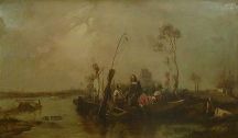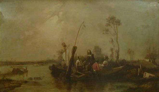 Etwa in der Mitte des Bildes, am rechten Ufer eines Flusses, der sich aus dem Vordergrund in die Bildtiefe schlängelt, liegt ein flaches Boot, das ein vornehm gekleidetes Paar bestiegen hat. Die junge Dame hat bereits Platz genommen. Der Herr steht noch und wendet sich den beiden Männern zu, die vor dem Kahn mit den Füßen im Wasser stehen. Sie sind mit dem Ausräumen des Bootes beschäftigt, das ihnen offenbar bis eben noch zum Fischen gedient hat, doch nun von den vornehmen Herrschaften benötigt wird, um nach einem Spaziergang auf dem Land bequem in die Stadt zurückzugelangen. Deren Silhouette erkennt man in der Ferne, weiter rechts die Ruine einer Kirche. Deutlich näher gerückt, ist am rechten Bildrand ein zwischen Wiesen gelegenes und von der Sonne beschienenes einfaches Haus zu sehen. Ein Vieh treibender Hirte und ein zweites Fischerboot vollenden den Anschein einer stillen ländlichen Betriebsamkeit an einem friedvollen Sommertag.