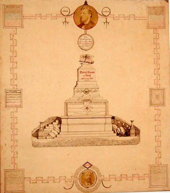Die Mitte nimmt die Darstellung eines Ehrenmales ein, das, mehrfach abgetreppt, auf der hohen Säule der „Liedertafel Concordia zu Aurich, gestiftet am 27. Juni 1837“ eine Lyra als Bekrönung trägt. Das Notenbuch unter der Lyra ist mit „Sonaten“ bezeichnet.