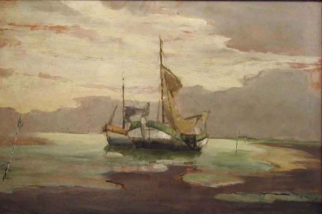 Der Tiefenwirkung tritt noch einmal Spannung vermittelnd die flächige Gestaltung der breiten Himmelszone gegenüber. Vor einer dumpfen Farbigkeit dringt von links eine helle Fläche ein, die in ihrer nach rechts gerichteten Form und ihrer unterschiedlichen Farbdichte eine erste Dynamik in die Stille einführt. Realismus suchend lässt sie an eine bei schwülem Wetter heraufziehende Wolkendecke denken, die in der scheinbar unerträglichen Stille Veränderung erahnen lässt. Noch aber zeigen die beiden Tjalken mit den schlaff herabhängenden Segeln völlige Windstille in Bodennähe an.