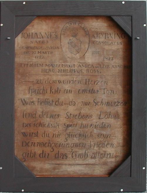 Sodann folgen auf der Leinwand die erwähnten Verse. Sie erinnern an Kyrning und wurden erst nach seinem Tode 1823 aufgetragen. Der wenig ausgefeilte Stil lässt daran denken, dass sie ein Kyrning nahestehender Verwandter oder Freund dichtete. In diesem engen persönlichen Bezug sind sie besonders ergreifend. Sie erinnern an den Dargestellten als einen Menschen, der aufgrund schwerer Schicksalsschläge seine Lebensziele nicht hatte verwirklichen können. Und sie geben dem Trost Ausdruck, dass er im Grabe nun endlich seinen Frieden finden wird.
