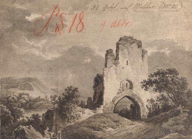 Doch irgendjemand hat die Dreistigkeit besessen, in das Bild mit Tinte und Buntstift hinein zu schreiben. „51 Gabet nach Molitor (N° 31)“ und „P S [durchgestrichen] 18 9 Abdr.“ prangt es deutlich sichtbar über der Turmruine. Und nicht nur wir schütteln heute fassungslos den Kopf über die Verunstaltung eines Kunstobjektes, auch unsere Altvorderen konnten diese Unsitte nicht begreifen. So ist an das Blatt ein kleiner Zettel geklebt, auf dem eine mit „L.“ signierende Person einige Informationen zu dem Bild geschrieben hat. Bei „L.“ handelt es sich um Dr. Carl Louis, der vom 1. Juni 1936 bis zum 1. September 1939 Direktor des Ostfriesischen Landesmuseums war. Er hatte sich in dieser Zeit durch alte Künstlerlexika gearbeitet, um die graphische Sammlung der Gesellschaft wissenschaftlich aufzuarbeiten. Sein Kommentar lautet: „Martin von Molitor ist ein bekannter Wiener Künstler gewesen. Dieses Blatt ist jedoch nicht erwähnt [in den Künstlerlexika]. Um so trauriger ist die von schlimmstem Dilletantismus [sic!] zeugende Verschmierung des Blattes, die wir leider sogar aus neuerer Zeit auf Urkunden und Ähnlichem finden. Man sollte dieses Blatt mit dem Ruf: „Legt endlich den Dilletanten [sic!] das Handwerk“ durch die ganze Welt schicken!“ Das sei hiermit geschehen.