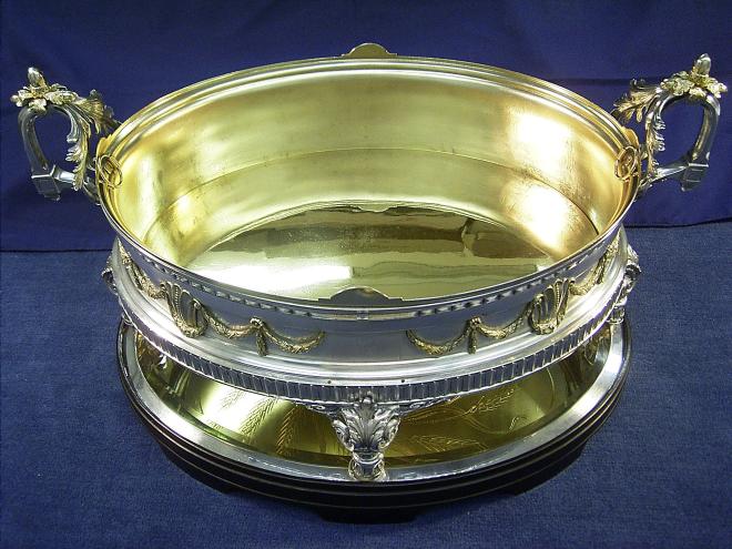 Tafelaufsätze sind kunstvoll geschmiedete Objekte, die – zumeist in der Tischmitte platziert – verschiedene funktionale Eigenschaften haben konnten, denen aber gemeinsam ist, dass sie die Tafel zieren sollten. Bei unserem Tafelaufsatz handelt es sich um eine ovale Halterung auf einem Untersatz, in die eine Terrine eingelassen ist. Welchen Zweck die Terrine erfüllen sollte, ist nicht geklärt, aber dass sie benutzt wurde, beweisen Gebrauchsspuren am Boden des Gefäßes. Vielleicht wurde es nicht zum Kredenzen von Speisen verwendet, sondern diente als Jardinière – also als Blumenständer.