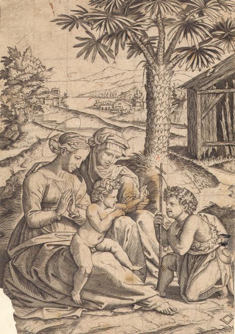 Die hier vorgestellte Radierung Raimondis zeigt nach dem Vorbild Raffaels Maria und Elisabeth mit dem Jesus- und dem Johannesknaben.