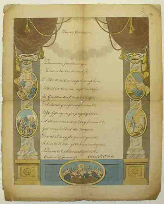 Am 1. Januar 1831 schrieb Okkel J. Okkels mit einer auch heute noch ohne Schwierigkeiten lesbaren Handschrift und in großen, deutlichen Buchstaben ein zwölfzeiliges Gedicht in niederländischer Sprache an seine Großeltern: