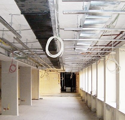 Haustechnische Rohinstallation im Zwischengeschoss. Noch fehlt die abgehängte Decke mit Heiz- und Kühlregistern.