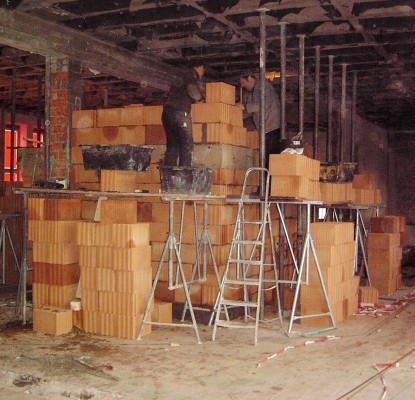 Verlegen der Bewehrungseisen für die Unterfahrt des neuen Aufzuges. Betonieren der Unterfahrt des neuen Aufzuges. Blick in den neuen Aufzugschacht. Mauerarbeiten am Schacht des neuen Aufzuges.
