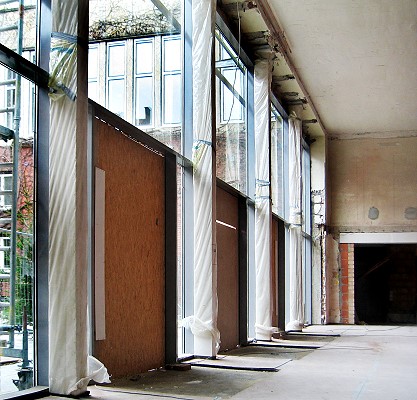 Für die neue Eingangssituation an der Brückstraße sind umfangreiche Abstützmaßnahmen notwendig gewesen. Jede der vorhandenen Stahlbetonstützen wurde entfernt und jede zweite durch Stahlhohlprofilstützen ersetzt, die das neue Fassadenelement tragen.